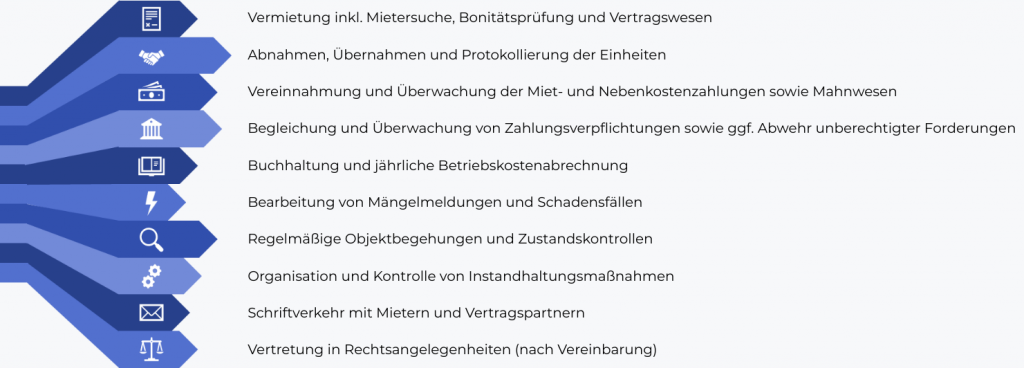 Wir übernehmen sämtliche organisatorischen, kaufmännischen und technischen Aufgaben – von der Mietvertragsabwicklung und dem Forderungsmanagement bis hin zur regelmäßigen Instandhaltung und technischen Betreuung.